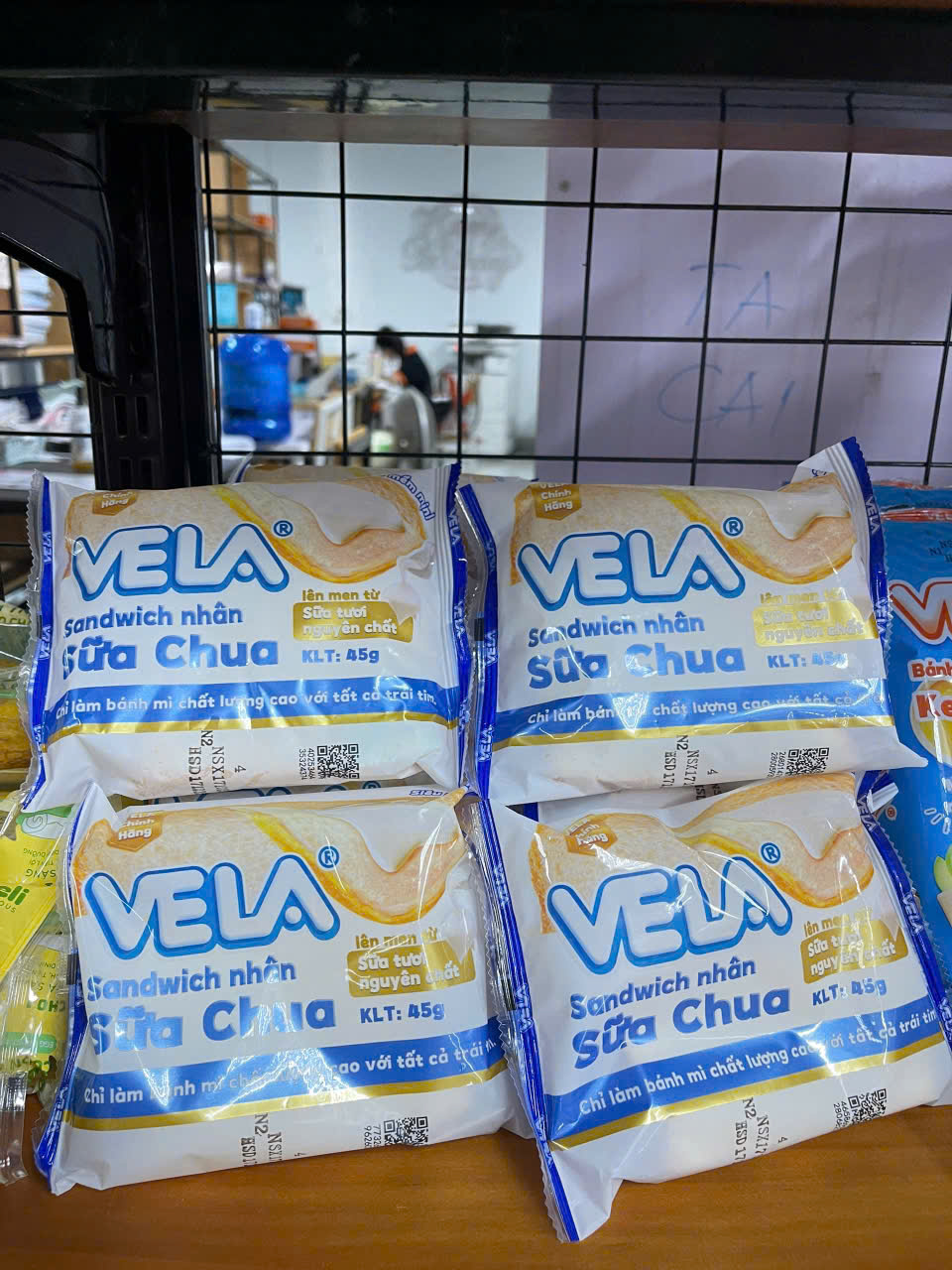 Sandwich nhân sữa chua VELA 45g, vị chua ngọt hài hòa và thơm ngon. Đánh giá 4.4/5 sao.